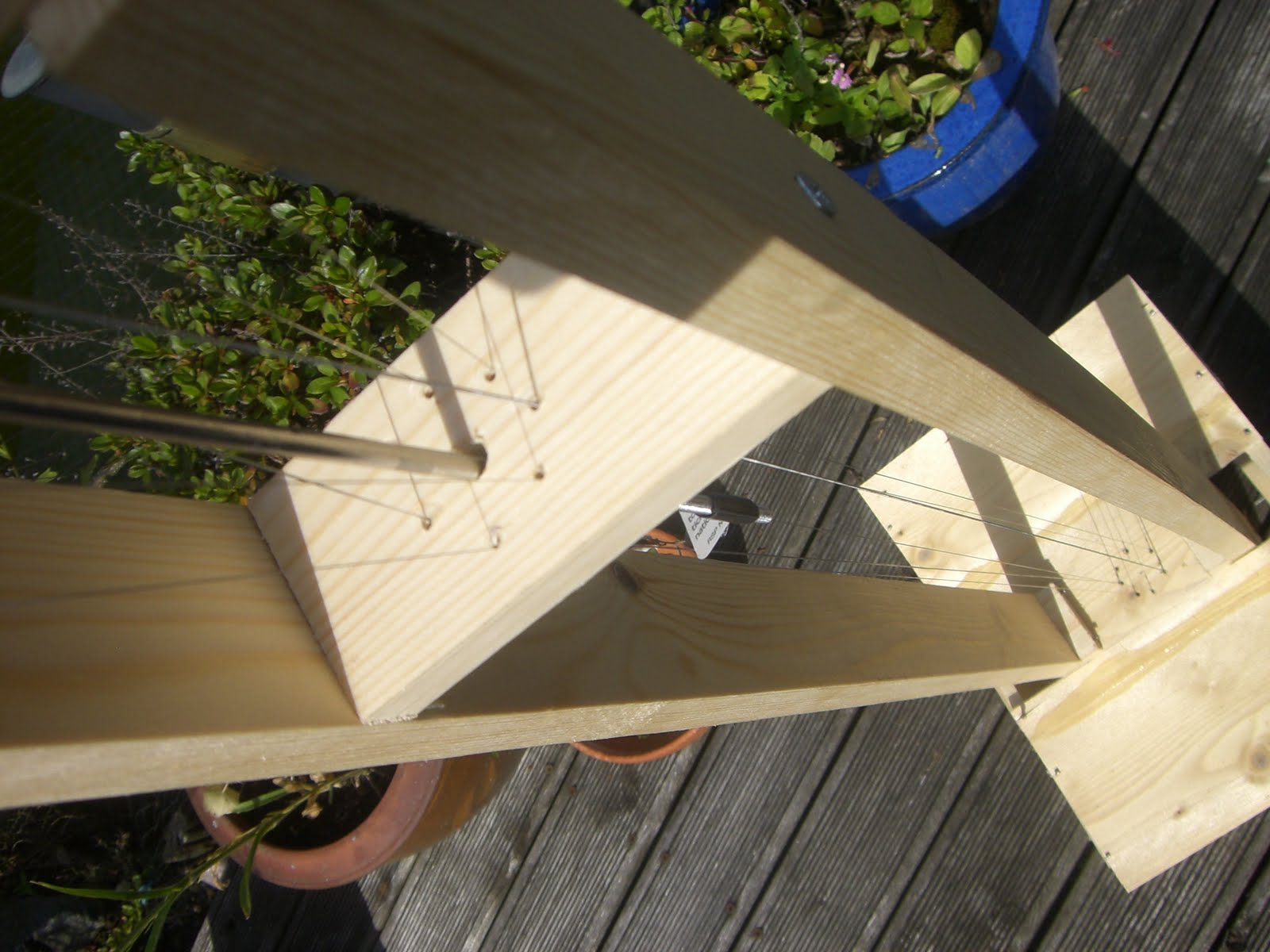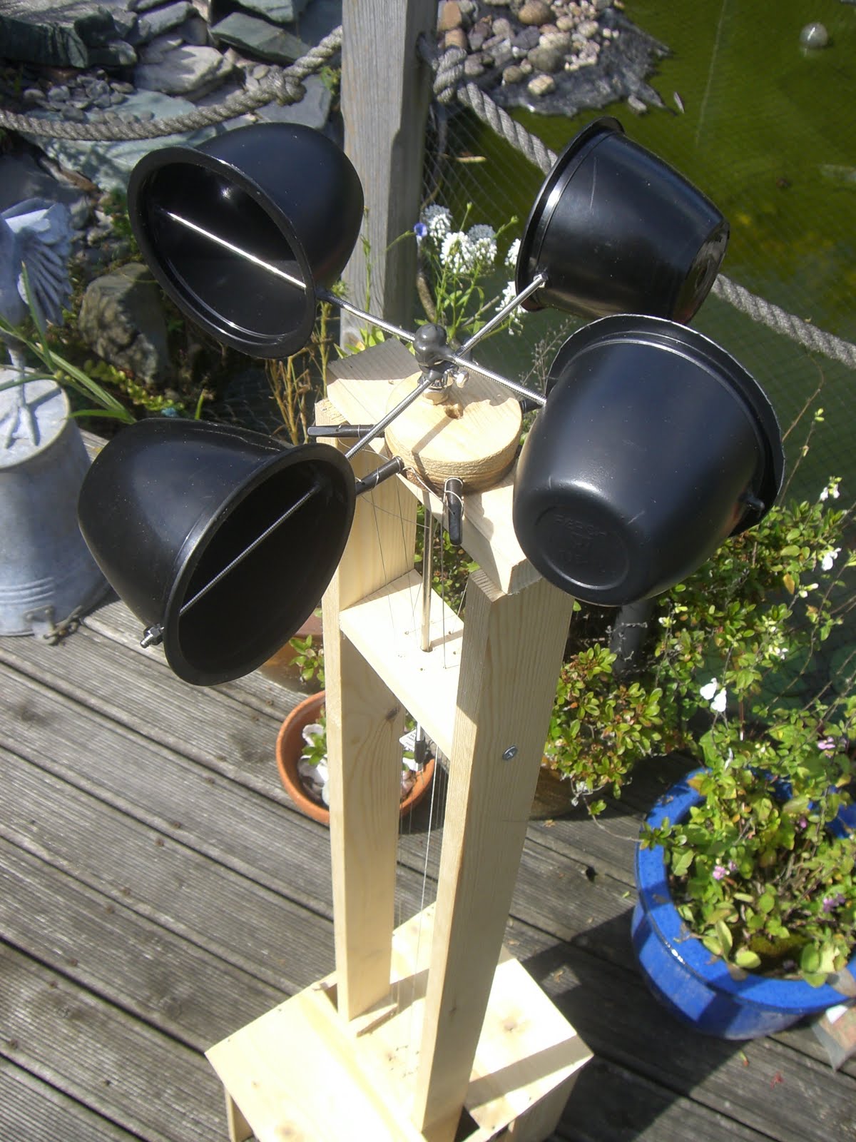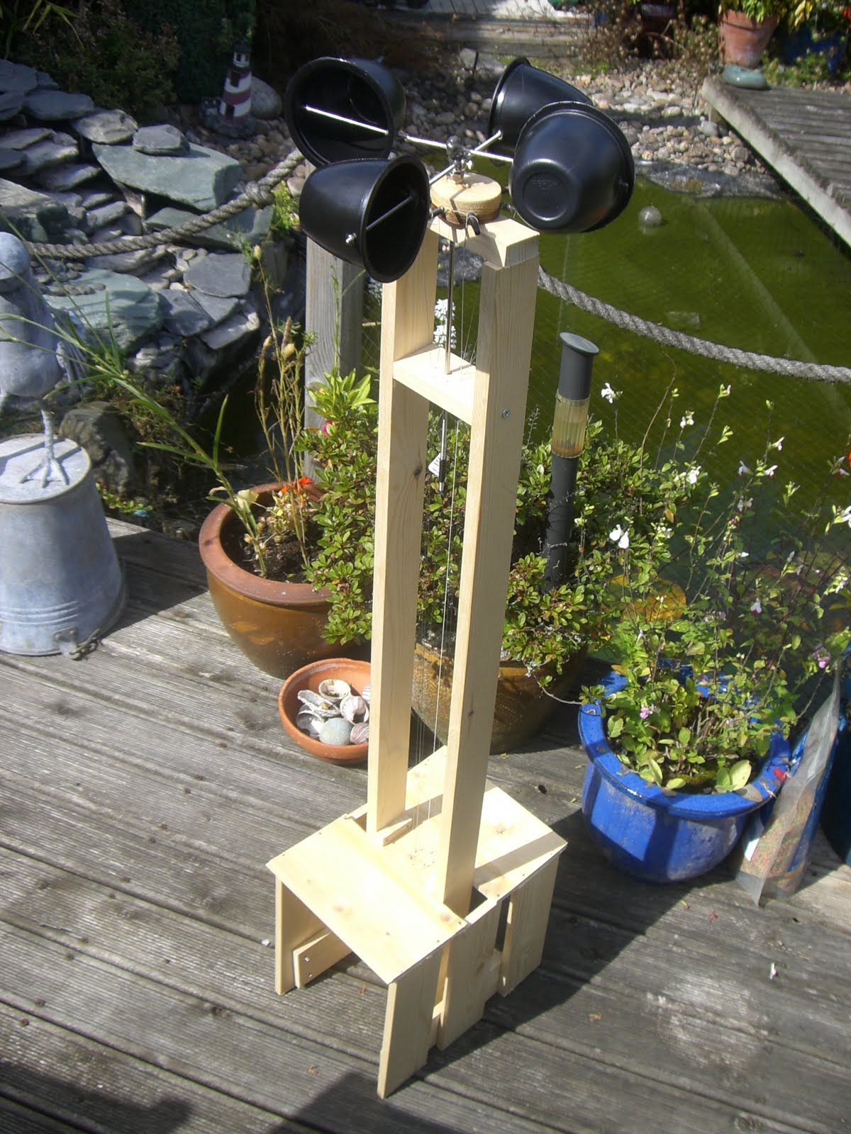 I used 4 dessert pots to act as a windmill that turns a metal rod with the plucking device attached. I had to experiment with what to use for the plucking bit and in the end the corner of a train ticket was the best! The strings are banjo strings and are set up to surround the shaft with the train ticket.