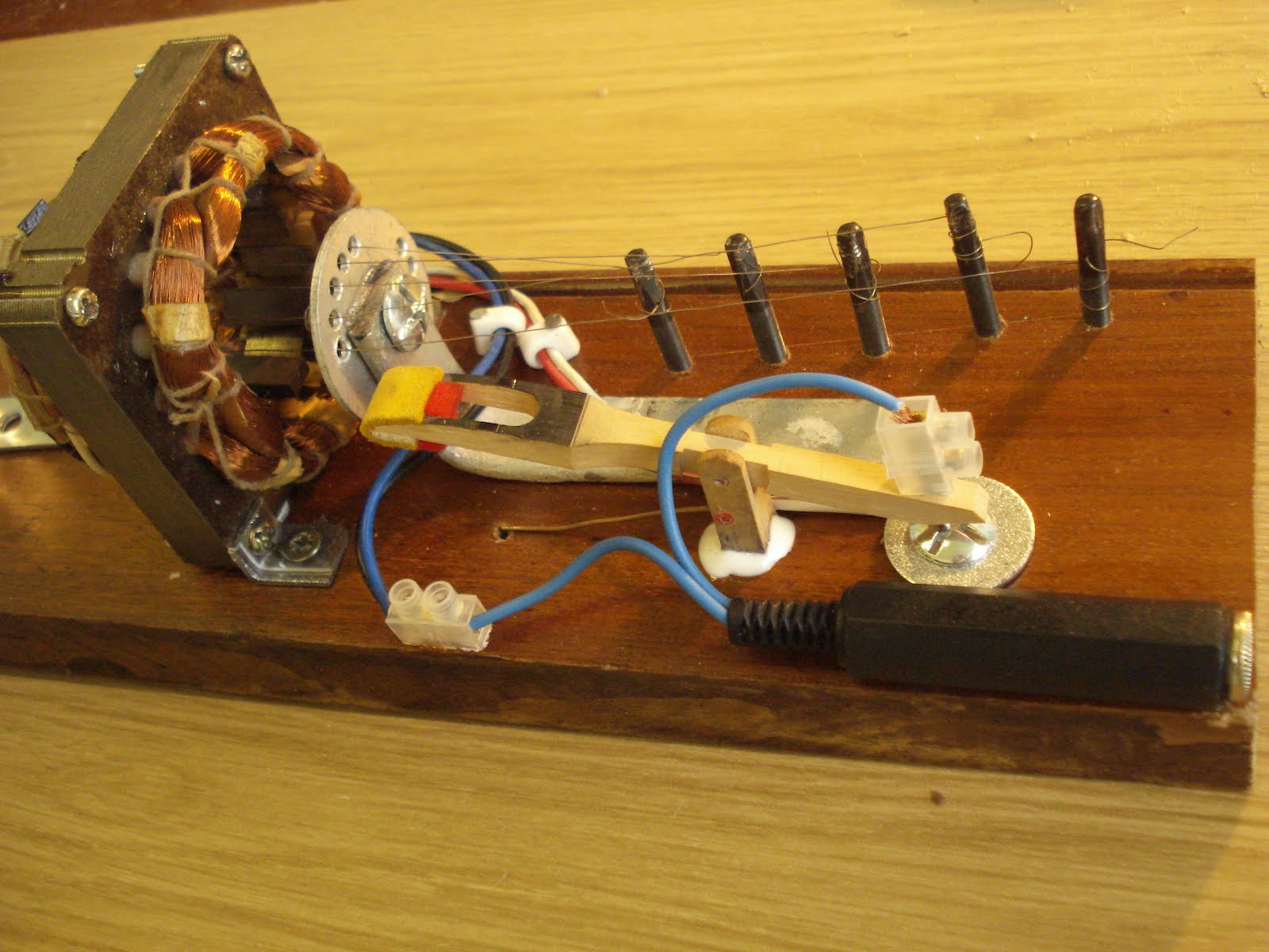 This is really great! Have you thought of using an electromagnetic exciter instead of a spinning pick-like trigger for the strings? Like the technology used in eBow and Fernandes' sustainer, it could smooth up the drone effect.