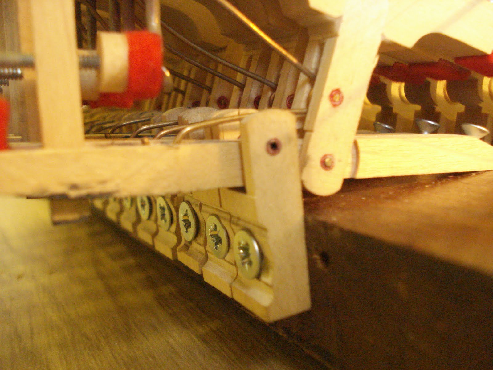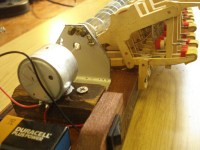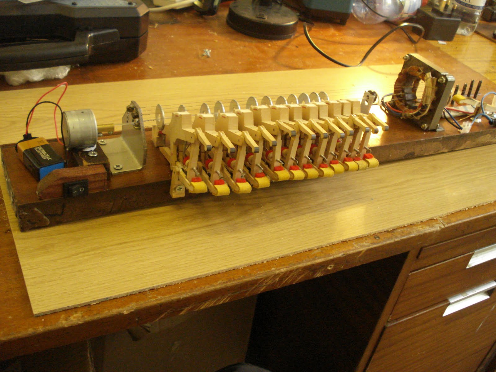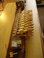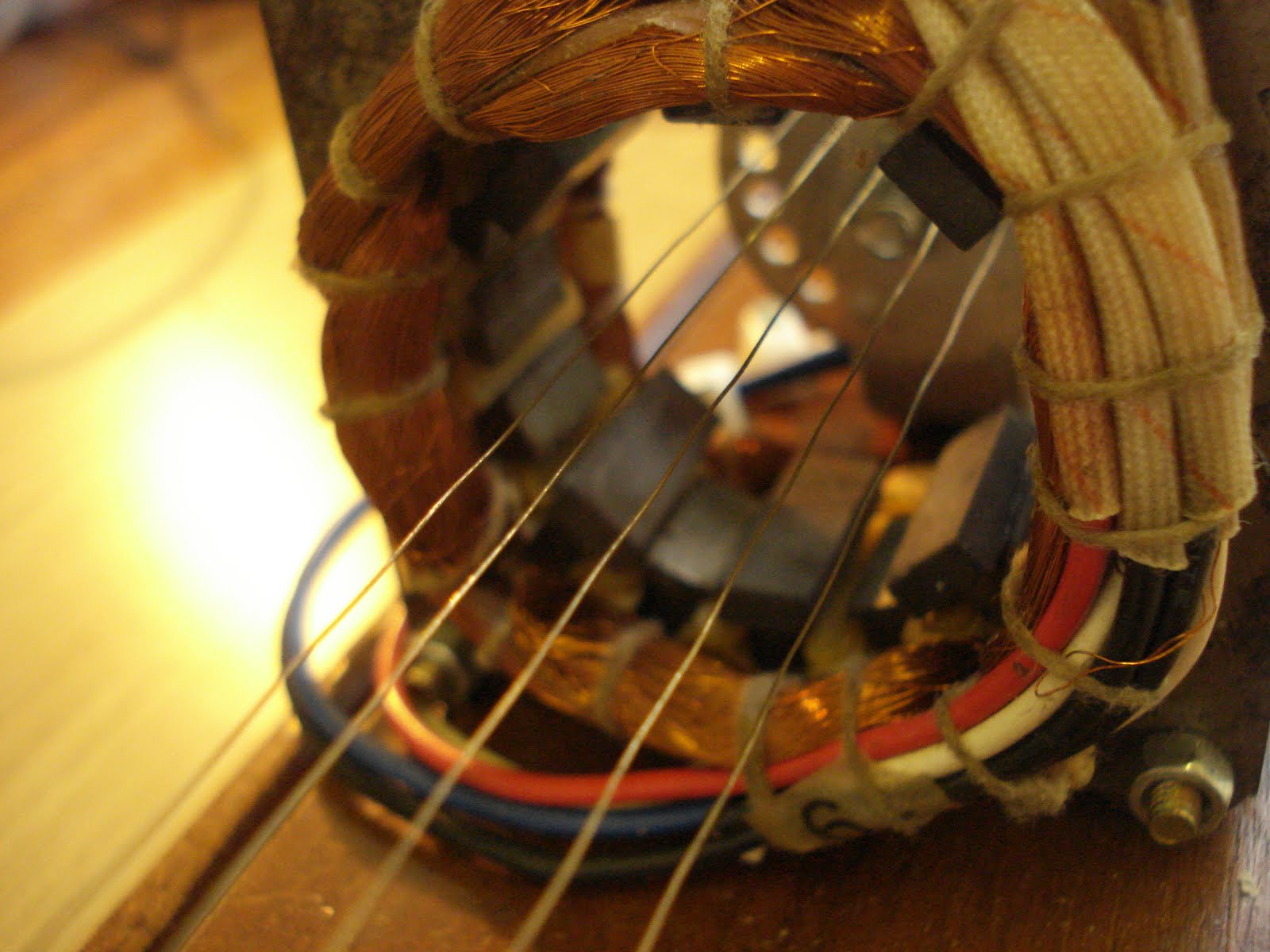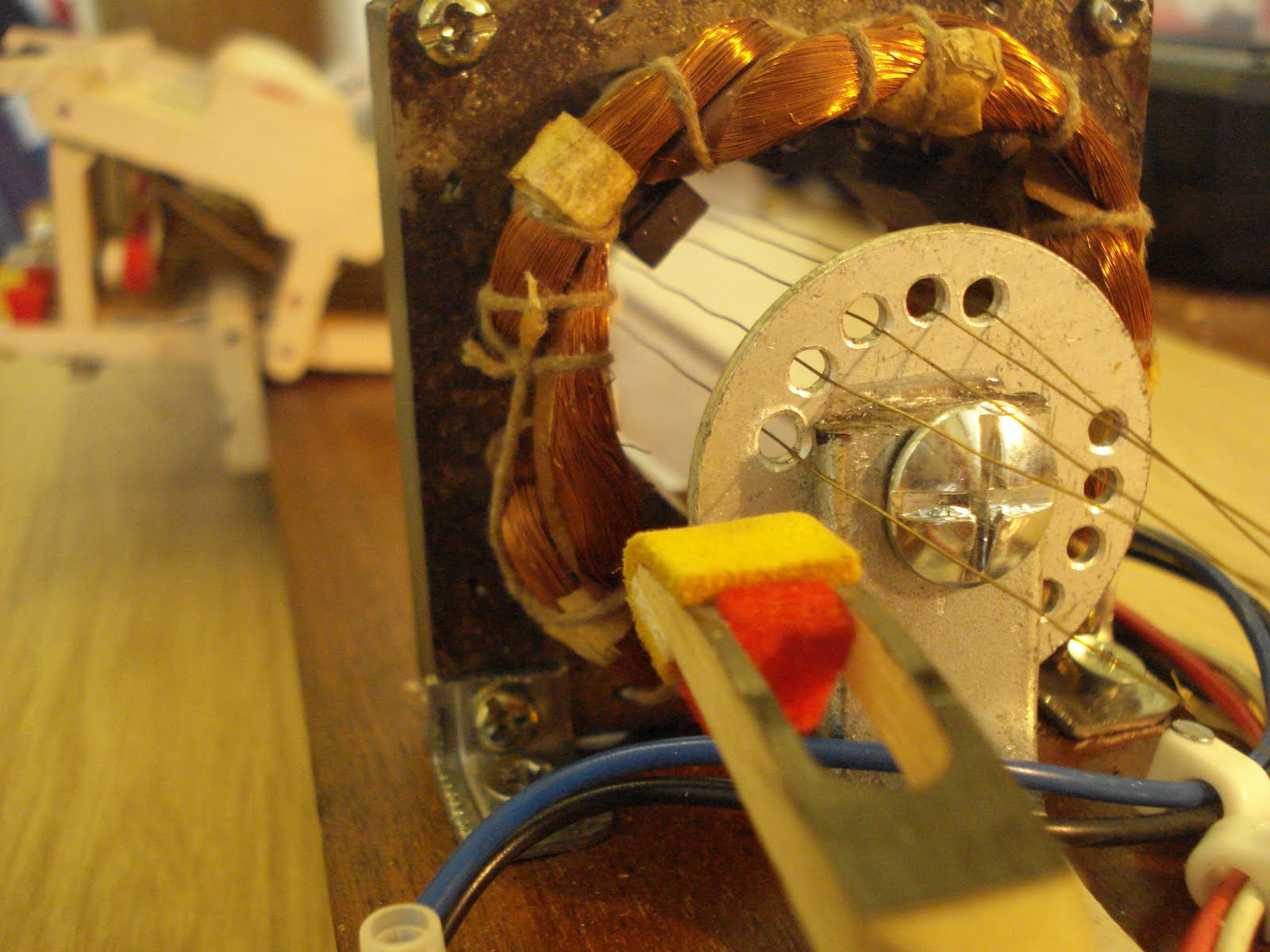 This latest instrument is an evolution of The Dronemachine I made a few months back. It uses the outer core of an electric fan motor as a pickup, a cassette player motor drives a piece of string which causes the musical strings to vibrate. The wooden peg looking things are actually part of the action in a Grand Piano, when you press down on the end, they raise the washers and shorten the length of the wire. It’s a pretty simple concept but it’s taken me ages to figure out how to put it into action!