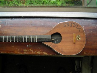 This quick instrument was an experiment in three different things. It’s been made from the leg of a piano stool and some scrap wood, nails, washing line wire and a motor from an old cd player.