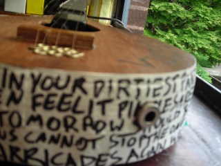 Another thing I wanted to try was play with aesthetics, I tried scratching some of the paint off the piano leg into a ROA-ish fox head. Also the sides I’ve painted and scrawled lyrics to A Silver Mt Zion’s The Triumph of our Tired Eyes.