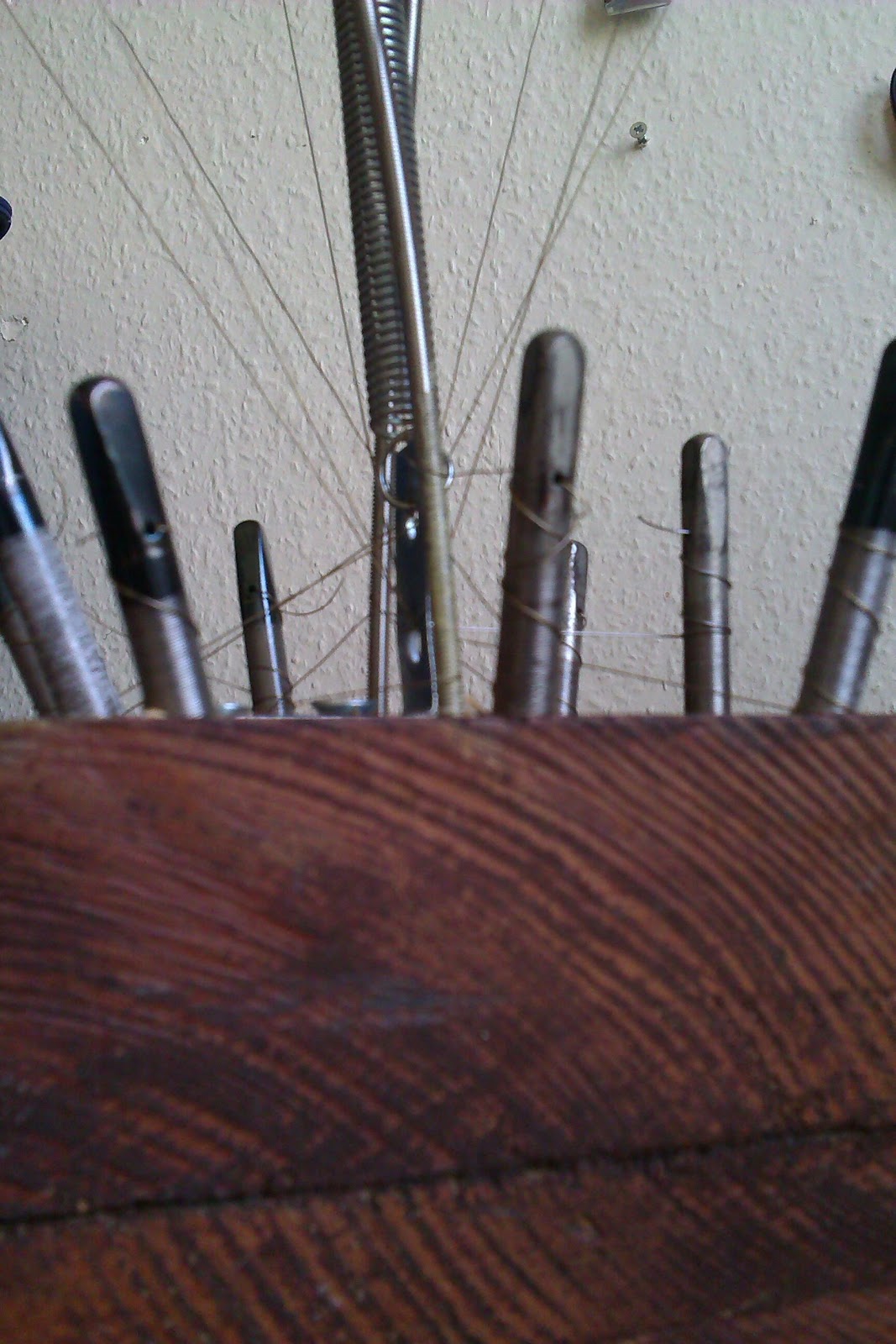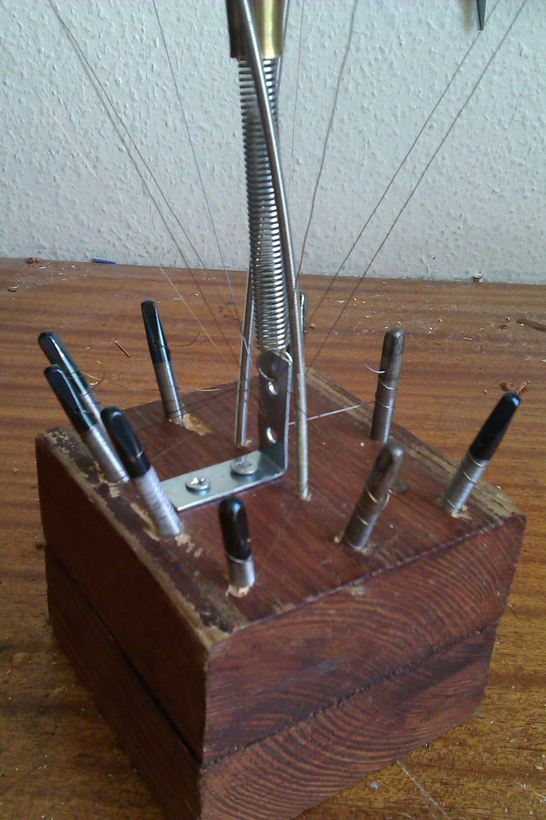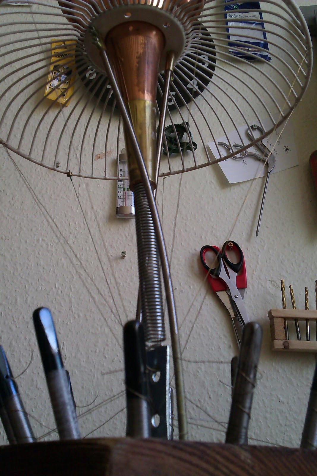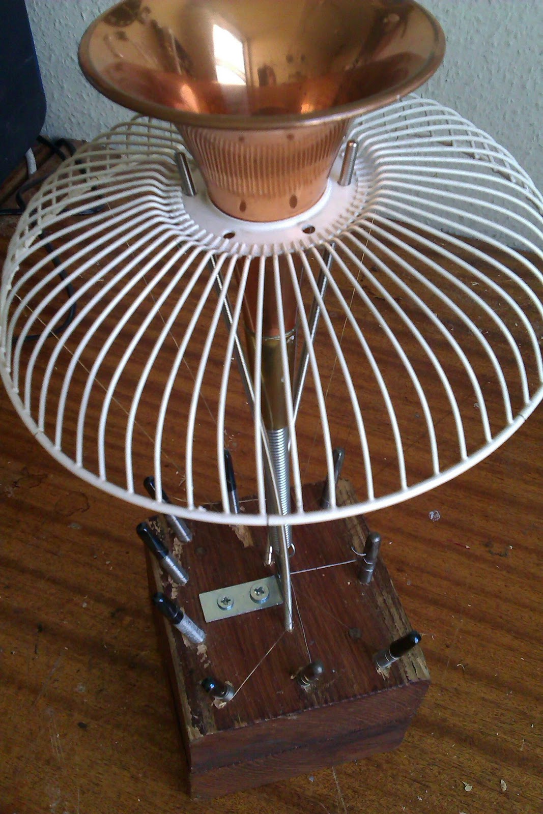 I looked around my bits of scrap that I keep for the ‘just incase’ times. I found this grill from a small electric fan that sounded fun when you hit it. 20 minutes later the Fanhorn Harp was complete!