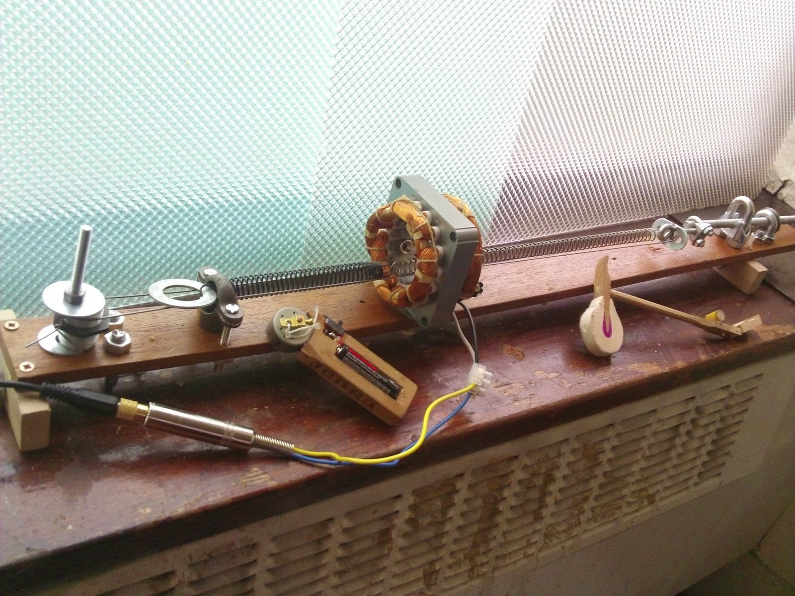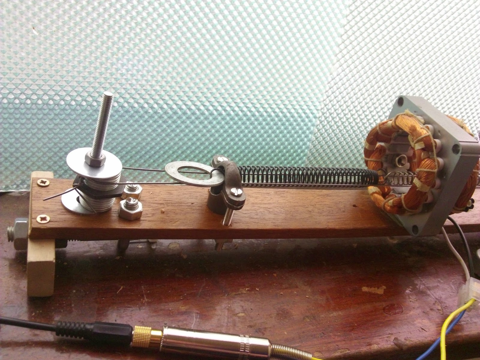 It uses Piano wire, the springs from an anglepoise lamp, the circular insides of an electric fan motor and a bunch of hardware to act as a DIY tuning machine. It has a hefty iron rod to act as a form of truss-rod to withstand the massive tensions that piano wire can create.