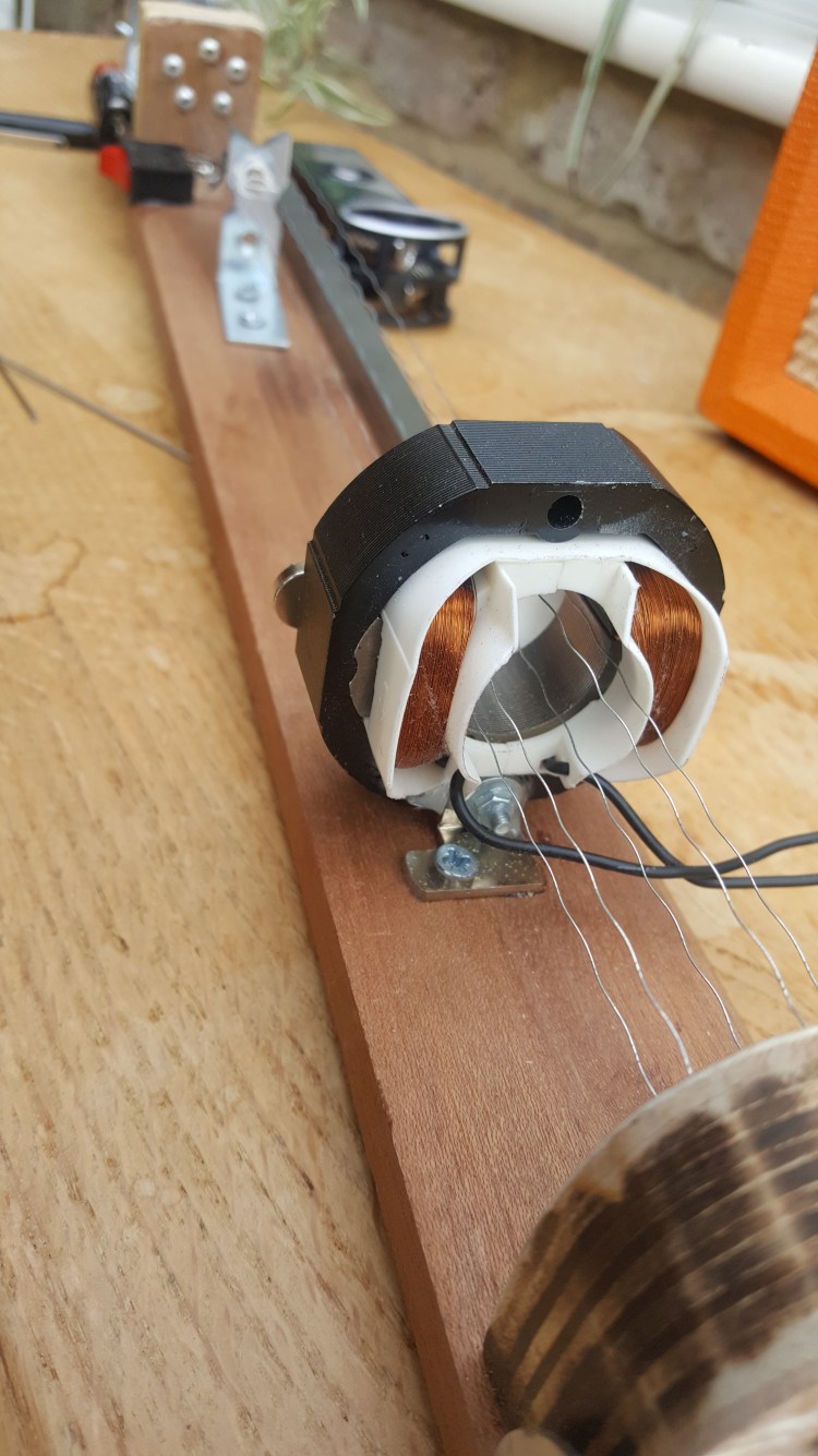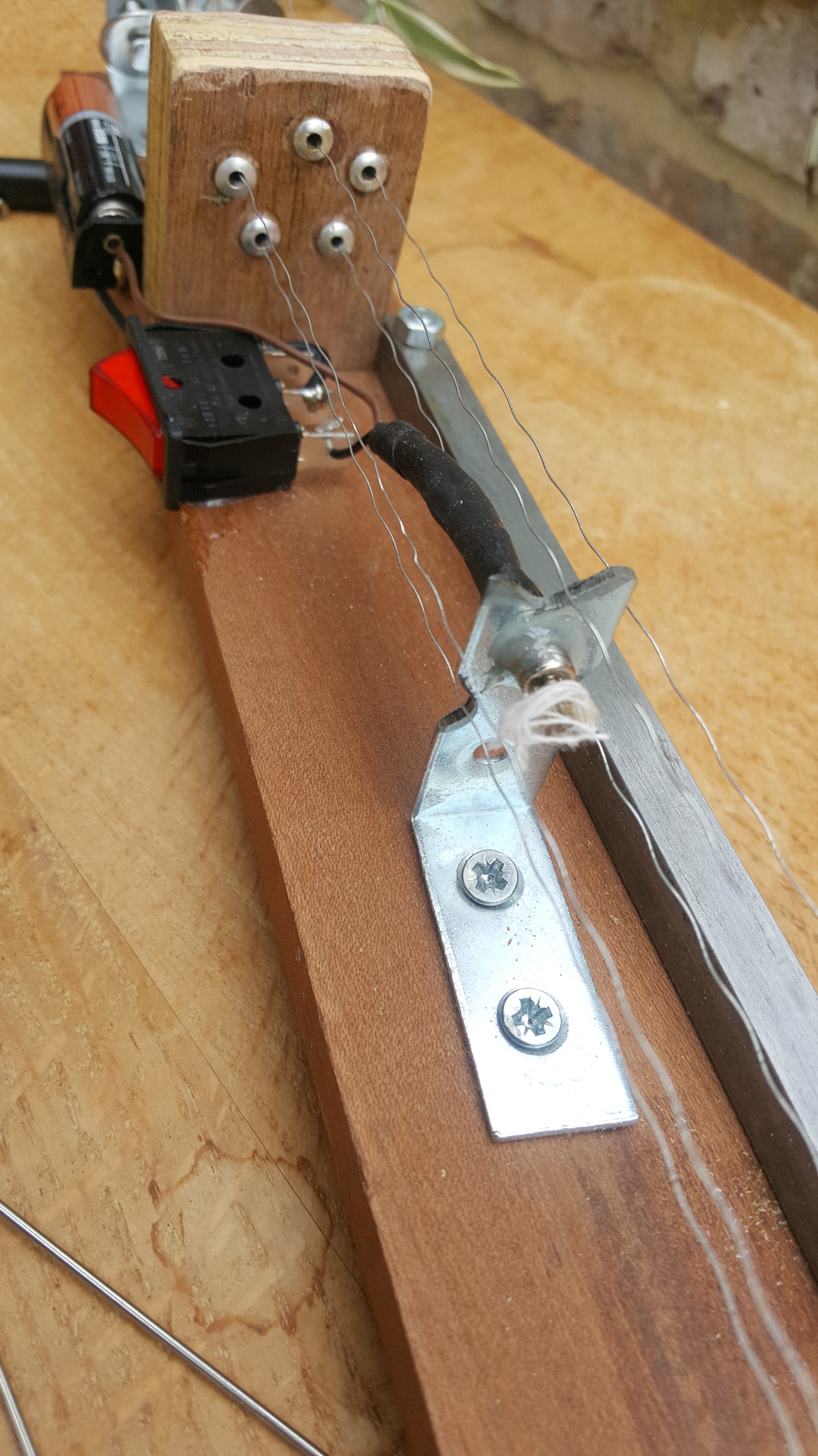 Made from the motor coil of an electric fan, an electric toothbrush motor, bike brake-cable strings and washers and bolts as tuning pins.