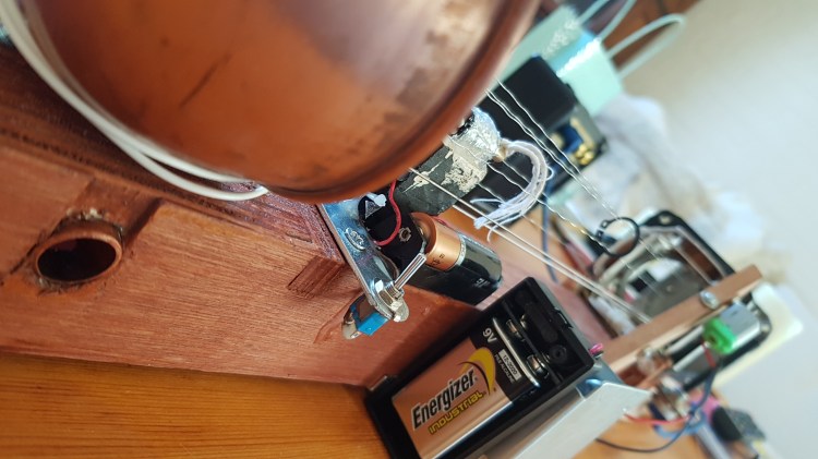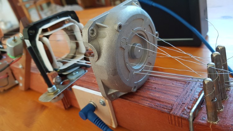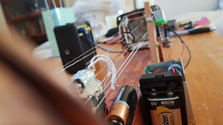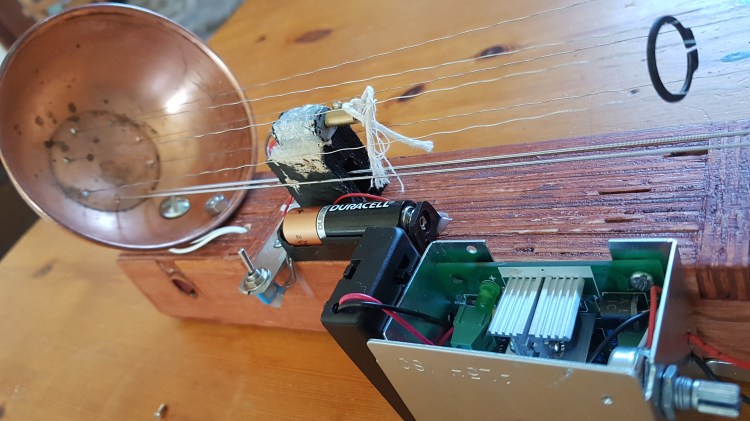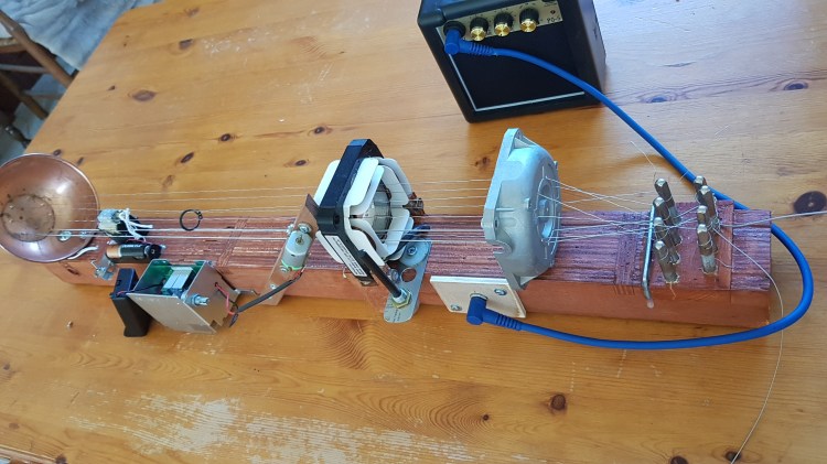 It combines the drones from the strings with the interference/noise from a motor controlled by a PWM circuit. It has inductive and piezo pickup and not a whole lot else!