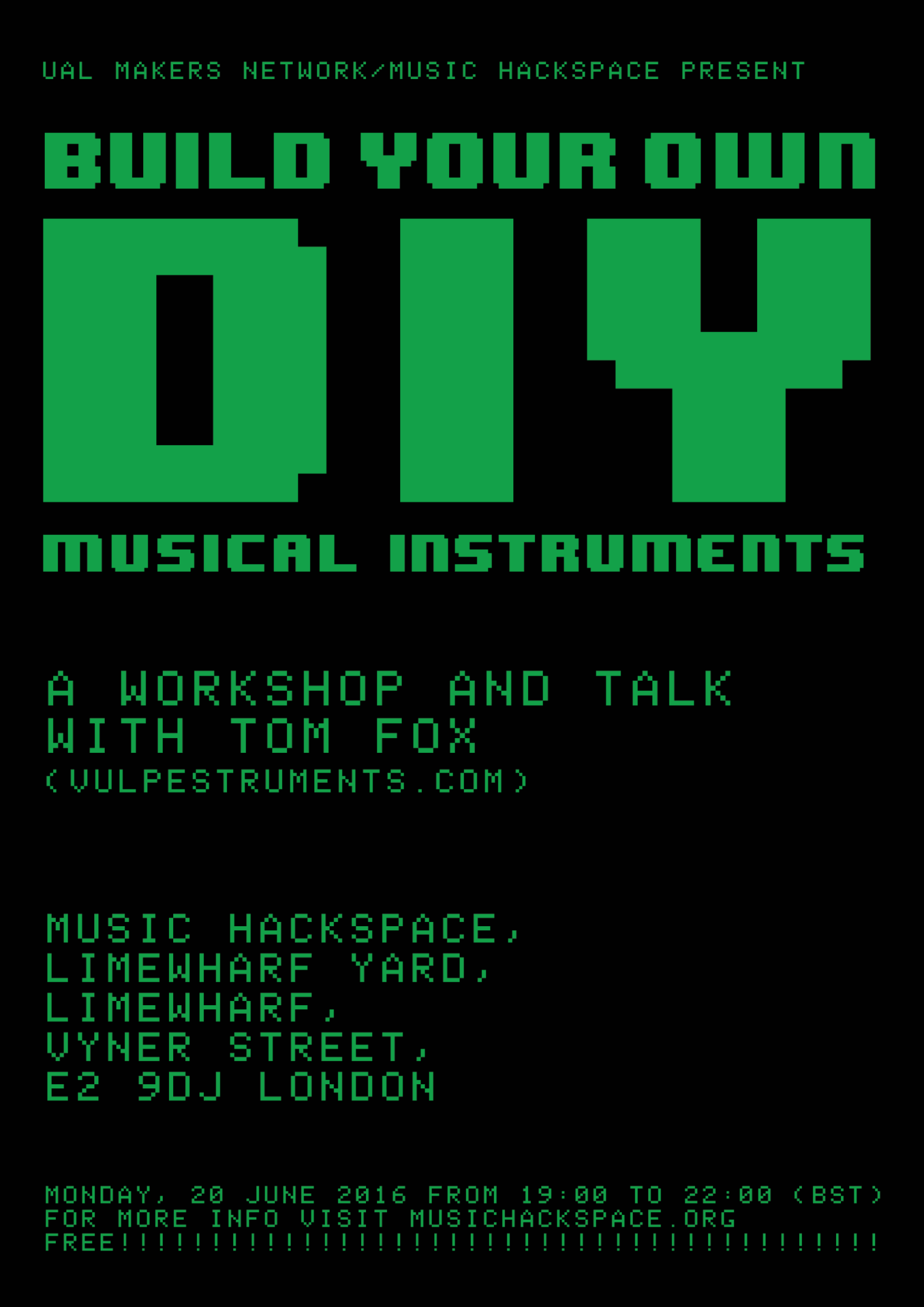 My next event is a talk and workshop for the UAL Makera network hosted at musichackspace. Details below: http://www.eventbrite.co.uk/o/ual-makers-network-10769072491