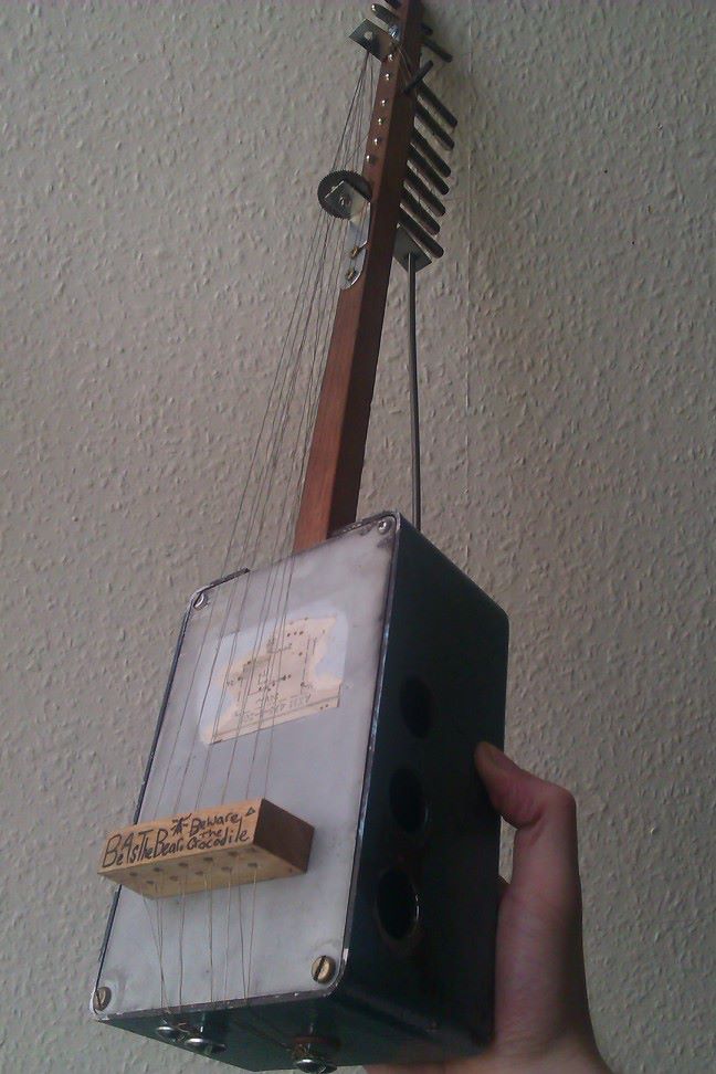 It’s made from 100% reclaimed materials. The Circular cog acts as an adjustable bridge that you can change the pitch of the strings by rotating it slightly. An unexpected result of the design was that when the bridge is turned, one half of the strings go up in pitch while the other half goes down! it sounds like this: